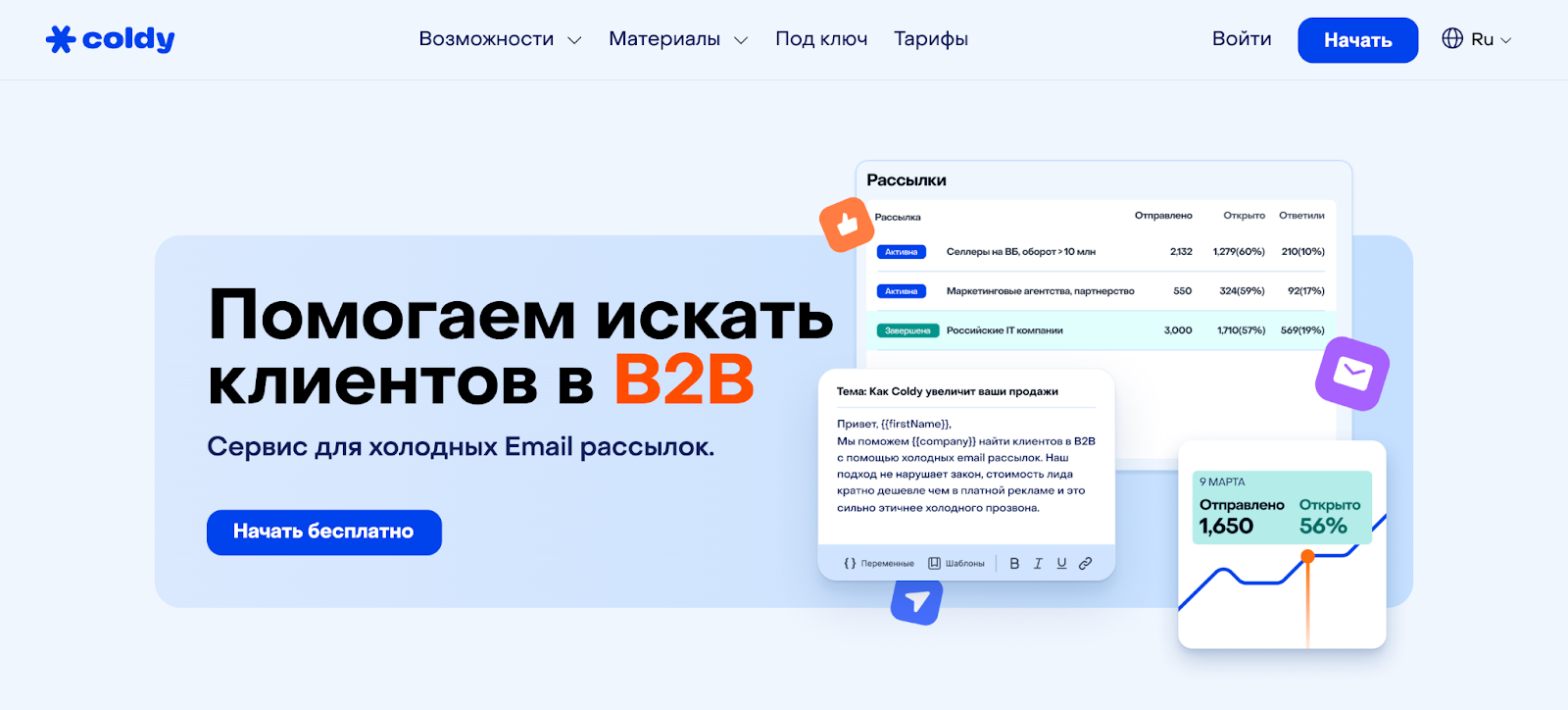 Что умеет: Coldy - один из первых российских сервисов для cold outreach. Здесь можно работать с несколькими почтовыми аккаунтами, прогревать почту, настраивать сложные цепочки, персонализировать каждое письмо.