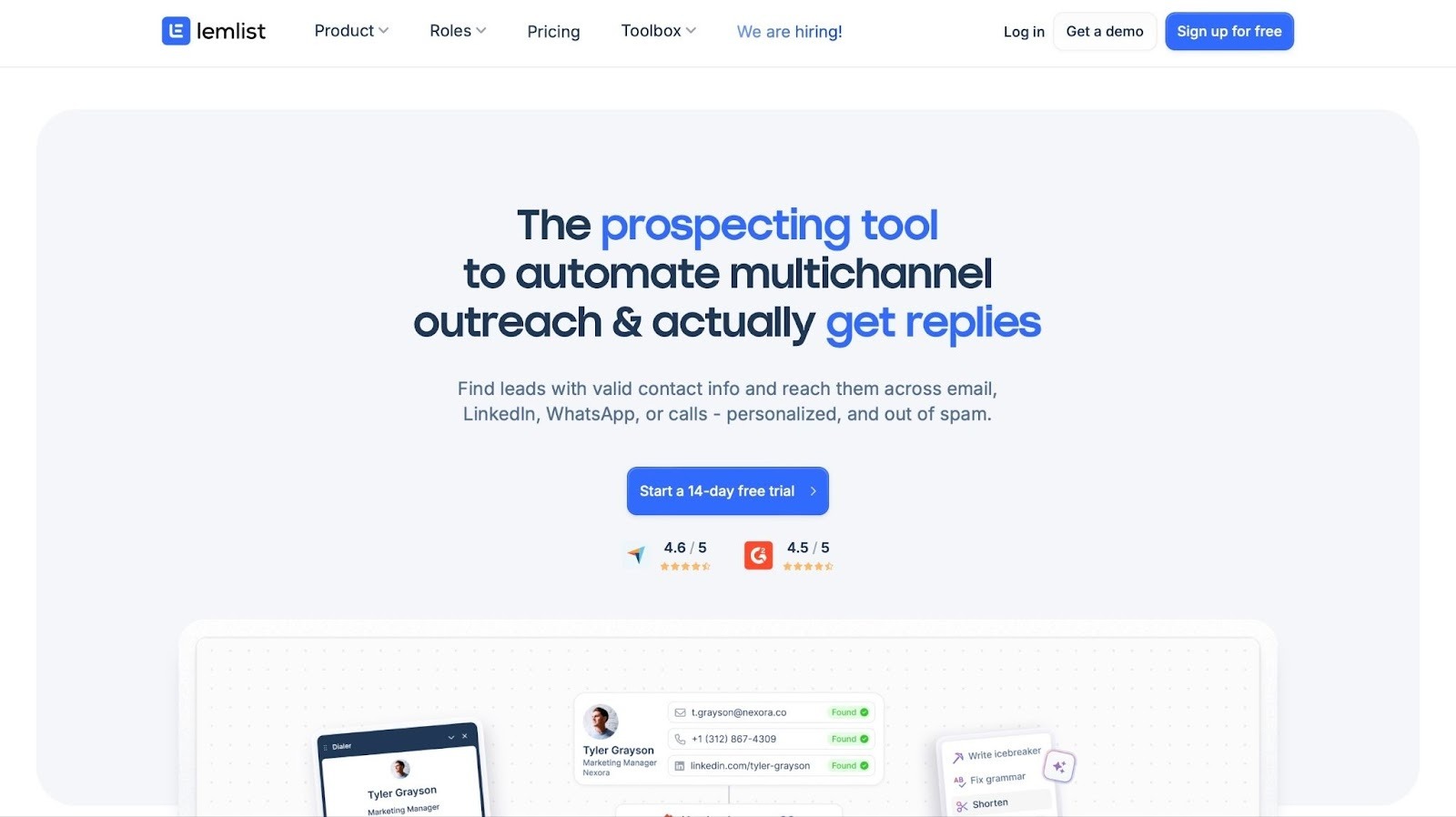 В базе 450 миллионов контактов с номерами телефонов и ссылками на LinkedIn. Есть конструктор цепочек и A/B-тестирование.