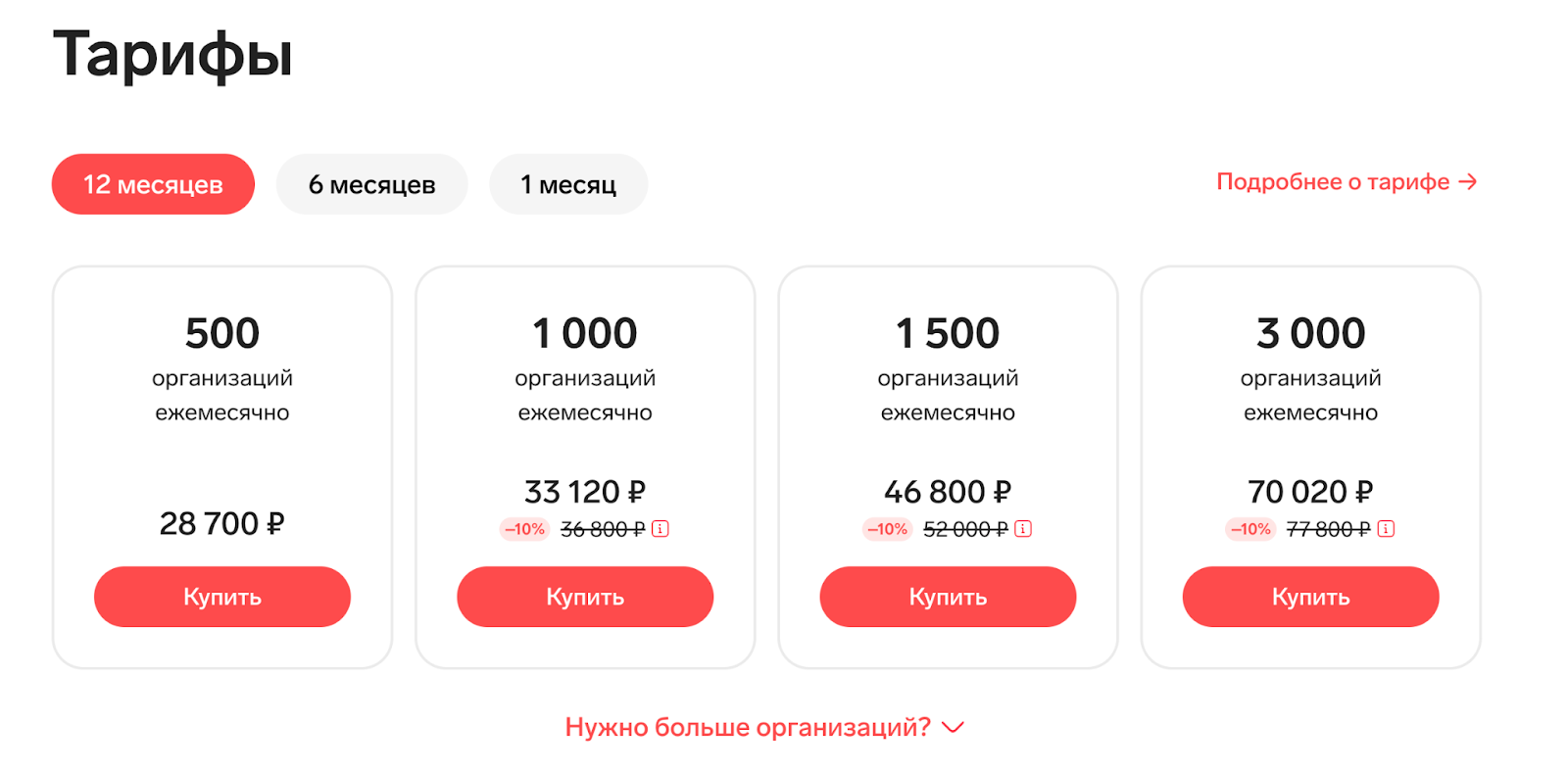 Базовый тариф включает основные возможности для формирования базы в Excel или CRM с выбором объёма выгрузки организаций ежемесячно. Конкретные цены зависят от лимита выгрузки.